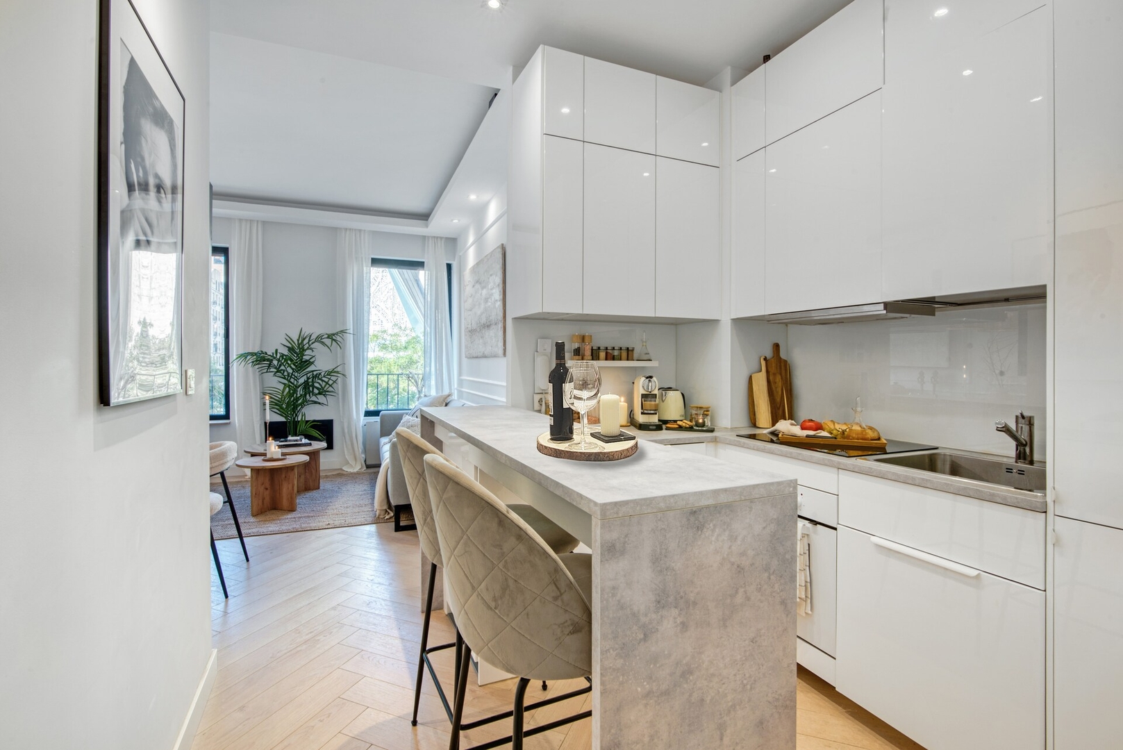 Spacious and stylish living room with a modern and cosy fireplace and SmartTV ( NETFLIX included), a fully equipped open KITCHEN open to the living room to invite you to cook your favorite recipes, and a trendy dining BAR to share pleasant moments with those who accompany you on your adventure in Madrid.